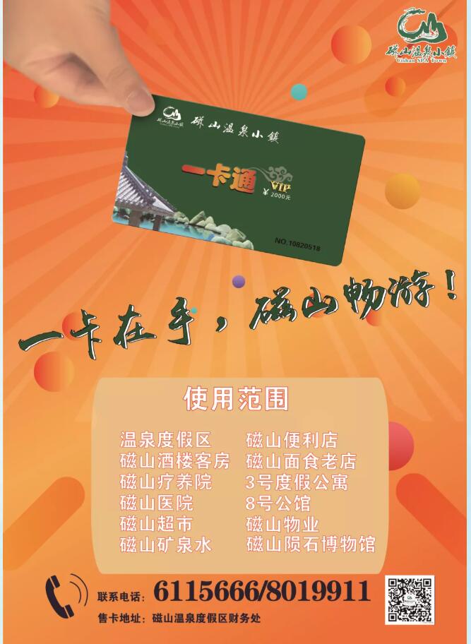 熟悉的人都知道:在磁山温泉小镇,除了泡温泉,还能满足吃、住、购等多重需求,而这些需求用一张卡就能结算,关键的是还能享受VIP优惠折扣,这张卡就是:磁山一卡通!